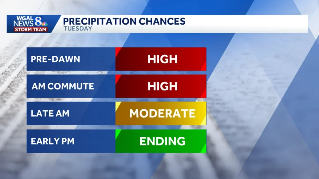 The weather tomorrow brings the season’s first true snowfall for much of south-central Pennsylvania. Expect slippery morning roads, heavier snow in the higher elevations, and a mix of snow and rain across southern counties. By the afternoon, things improve, but icy spots may return late at night.